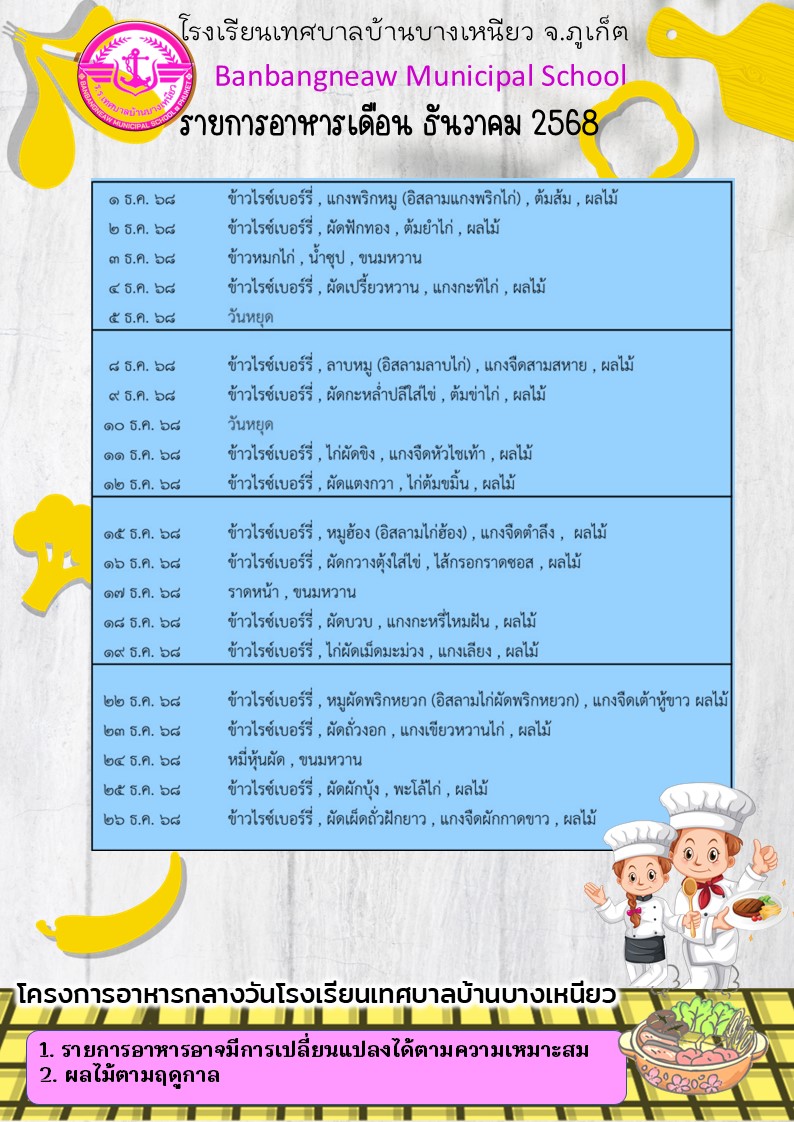 รายการอาหารกลางวัน เดือนธันวาคม 2568