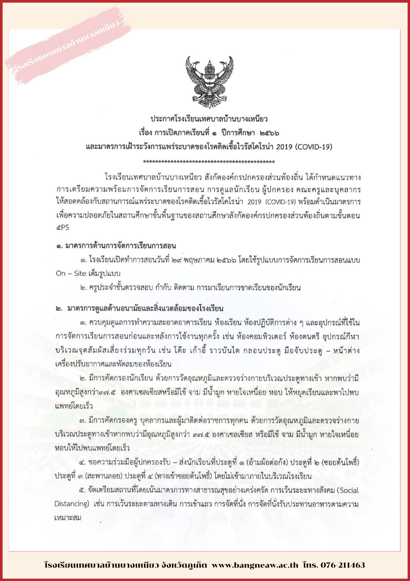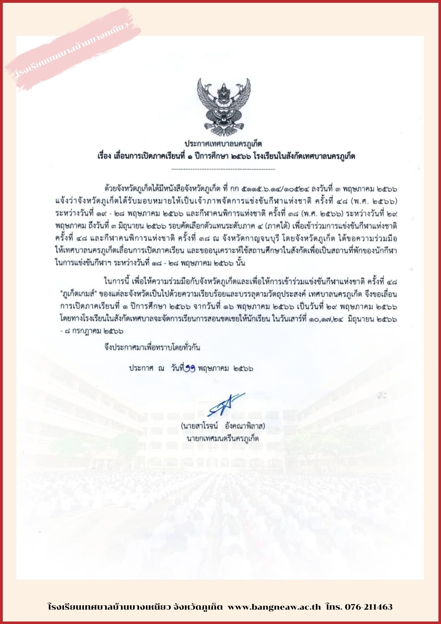 ประกาศการเปิดโรงเรียนภาคเรียนที่ 1/2566