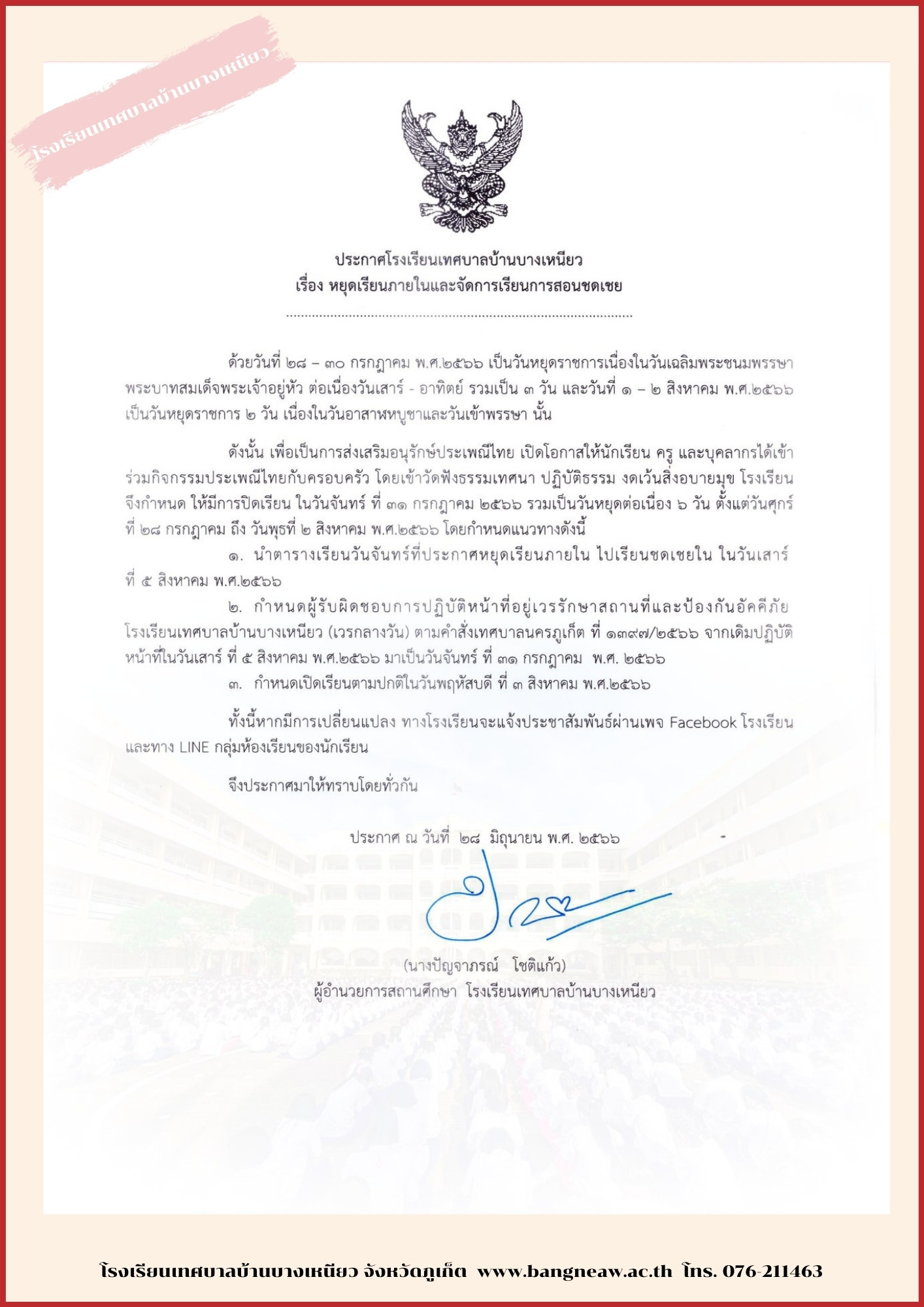 ประกาศหยุดเรียนภายในและสอนชดเชย