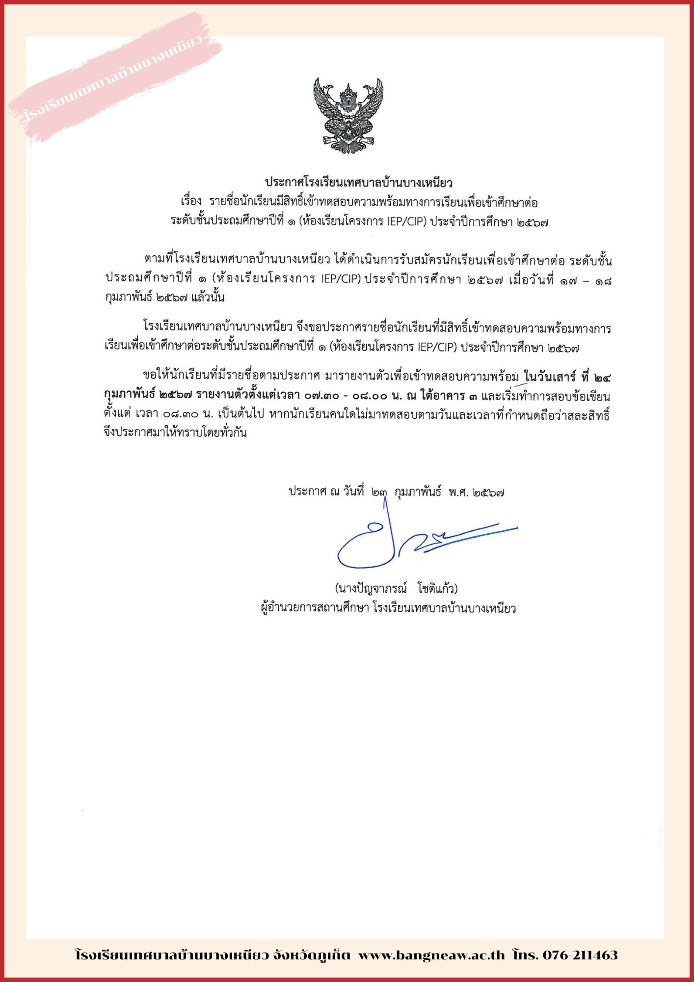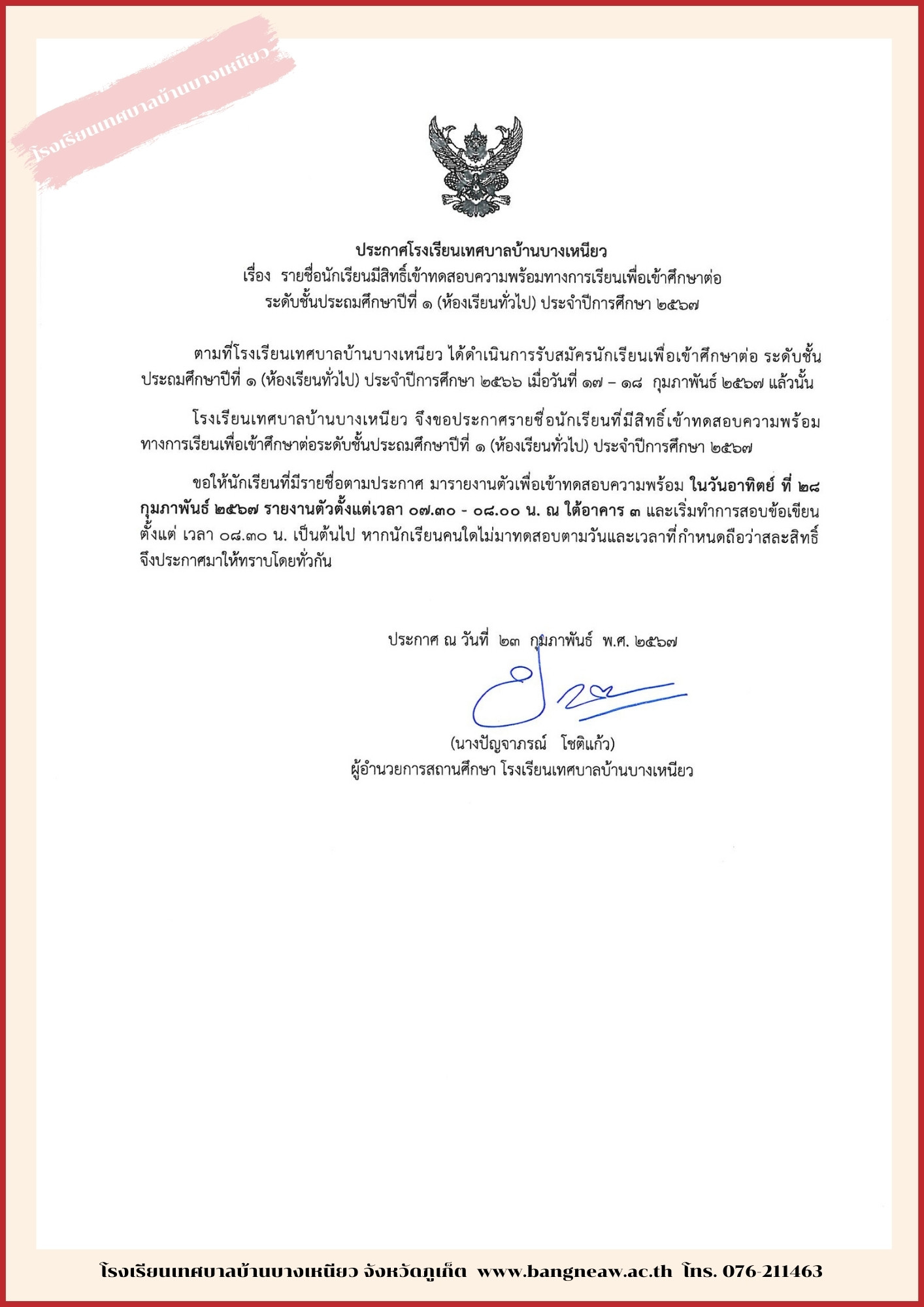 ประกาศรายชื่อนักเรียนผู้มีสิทธิ์เข้าทดสอบ ป.1/2568
