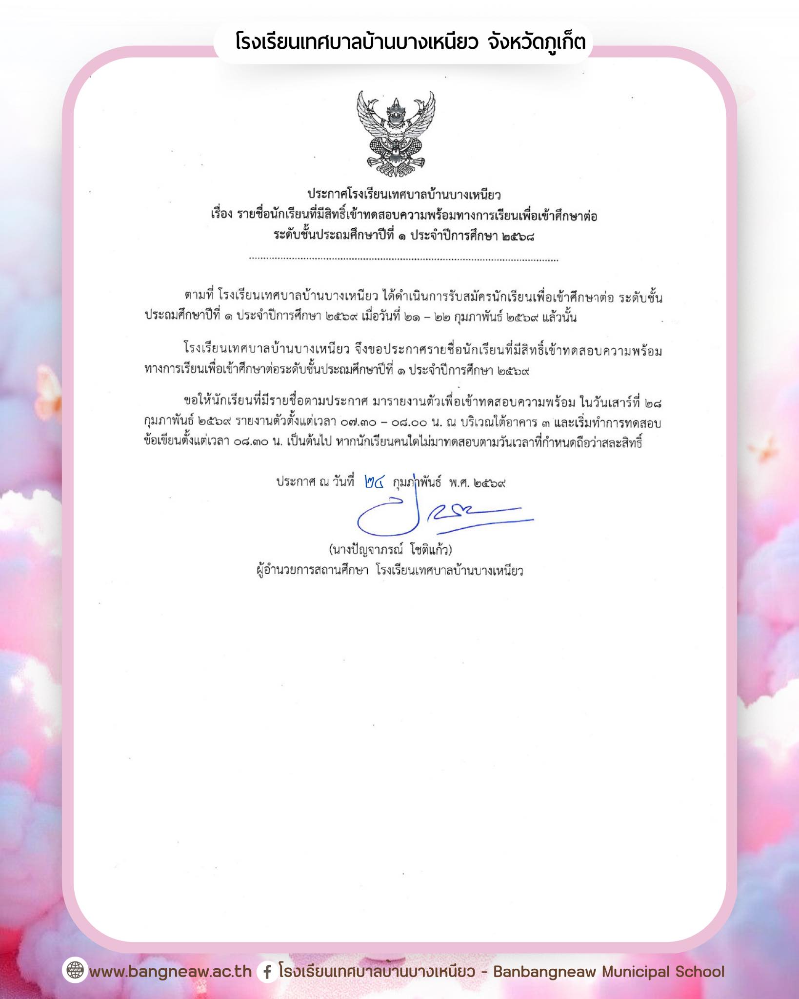 รายชื่อนักเรียนที่มีสิทธิ์เข้าทดสอบความพร้อมการเข้าศึกษาต่อระดับชั้นป.1/2569 (ห้องเรียนโครงการพิเศษ)
